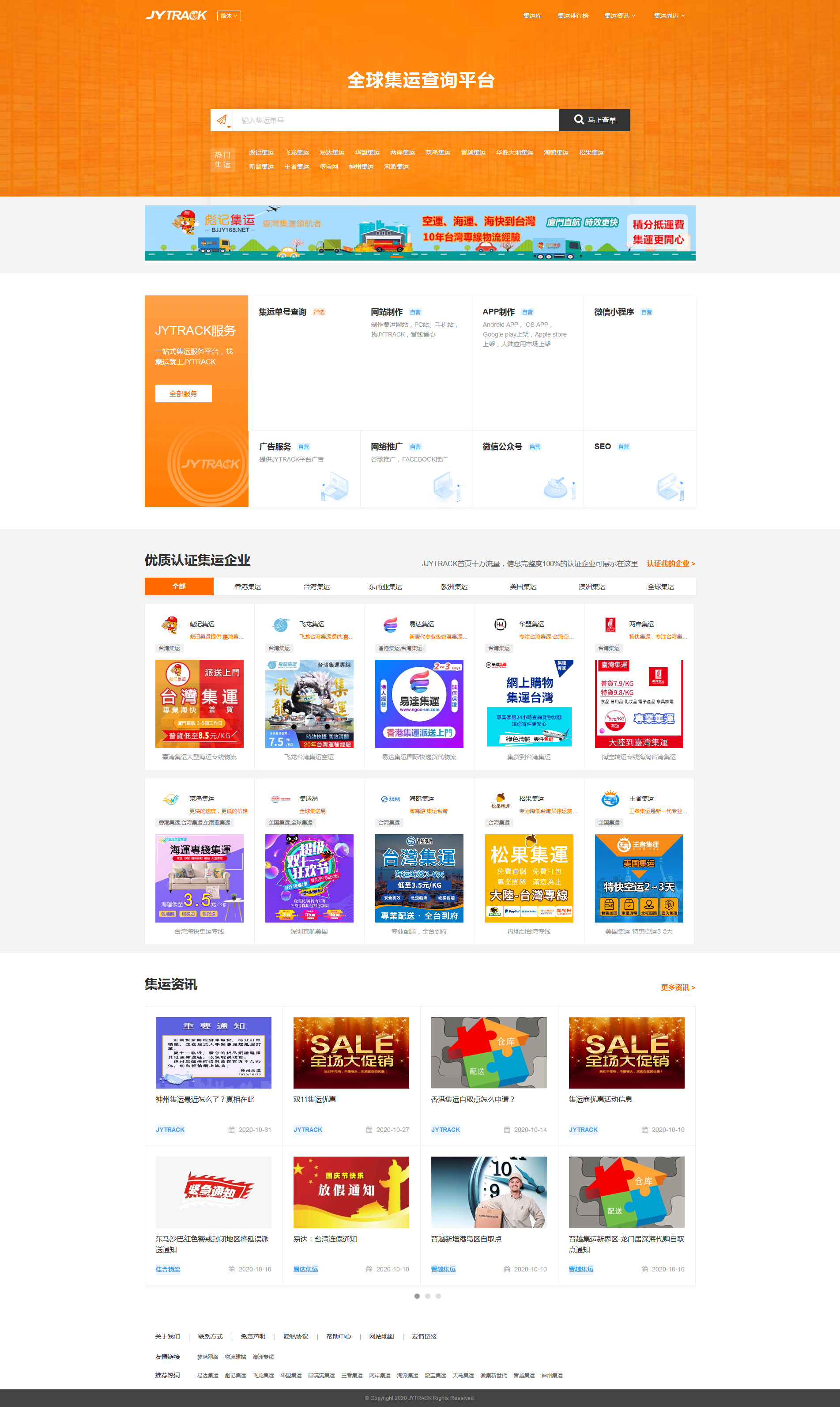 项目介绍:JYTRACK全球集运查询平台(www.jytrack.com),专注于解决集运行业信息化的难题,集成了国内外500+家集运公司的单号查询、收货仓库查询、网址查询、电话查询等服务。经过近几年的发展,JYTRACK已经成为全球智能集运服务平台中的佼佼者。目前,JYTRACK与梦魅网络、爱物流网等互联网公司保持良好合作,并与晋越集运、彪记集运、派宝集运、淘派集运、神州集运、易达集运等国内外集运物流公司建立互利共赢的商务合作,为国内外大型电商网站提供增值服务,随着互联网行业、电子商务和集运行业的飞速发展,公司的发展日新月异