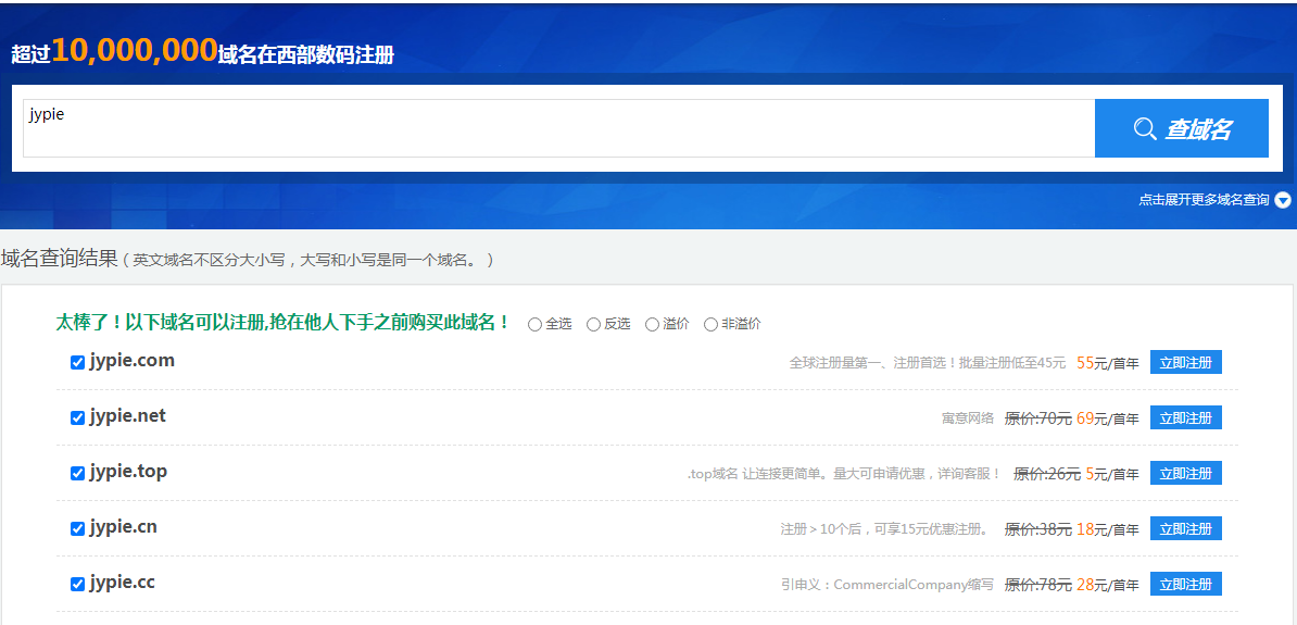 随便找个可以购买域名的网站,我们这里拿西部数码来讲解。