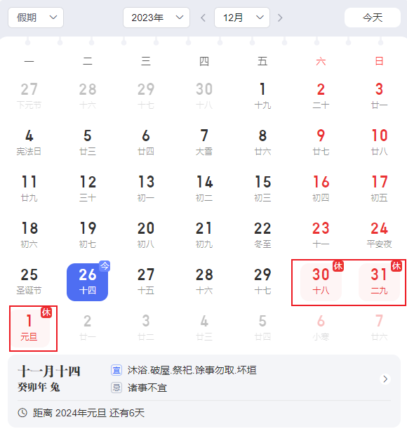 2023年12月30日(周六)放假休息,2024年01月02日(周二)开始恢复上班。