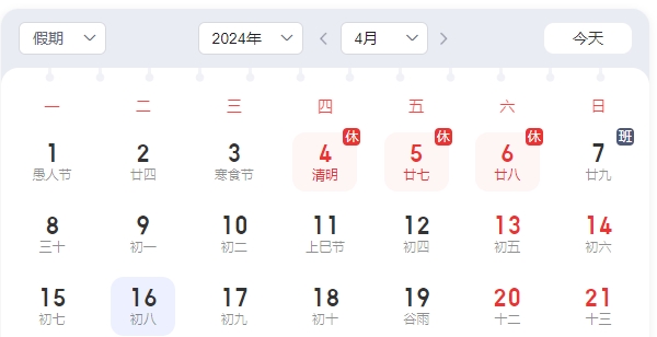 根据国家法定假期的规定,并结合公司实际情况,现对2024年清明节放假做出安排,具体如下: