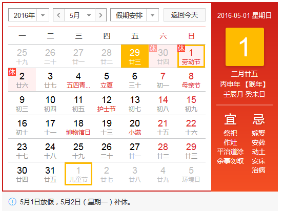 2016年4月30日至5月2日放假,共3天;2016年5月3日(星期一)正式上班。在假日期间,我公司不安排技术支持等相关事宜(紧急处理电