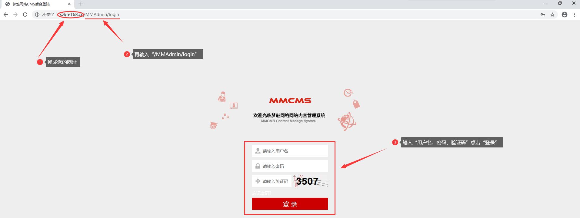 一、浏览器地址栏输入网址,您的网址/MMAdmin/login