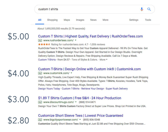 谷歌使用拍卖方式出价来设定价格。以下图为例,“custom shirts“这个关键词下有5个出价者,分别为:5美元、4美元、3美元、2.8美元,搜索排名按照出价高低排序。